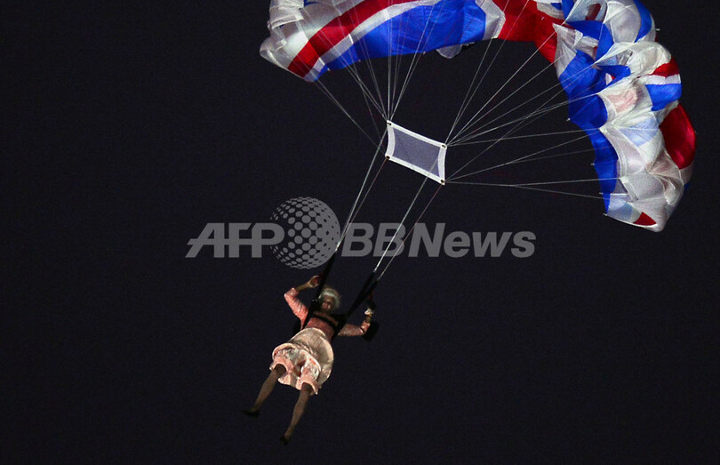 上空からパラシュートで舞い降りるエリザベス女王(Queen Elizabeth II)に扮装した出演者(2012年7月27日撮影)。(c)AFP/OLIVIER MORIN
