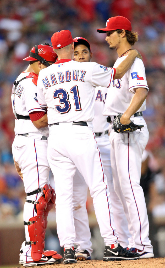 投手コーチのマイク・マダックス(Mike Maddux、中央)と言葉を交わすテキサス・レンジャーズのダルビッシュ有(右、2012年7月27日撮影)。(c)AFP/Getty Images/Layne Murdoch