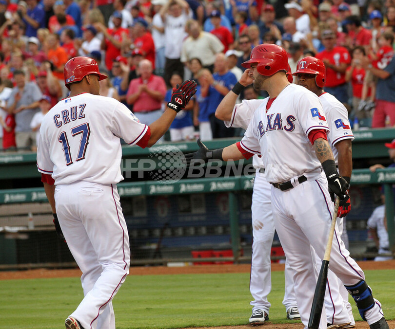 1回裏に3点本塁打を放ち、マイク・ナポリ(Mike Napoli、右)から祝福を受けるテキサス・レンジャーズのネルソン・クルーズ(Nelson Cruz、左、2012年7月27日撮影)。(c)AFP/Getty Images/Layne Murdoch