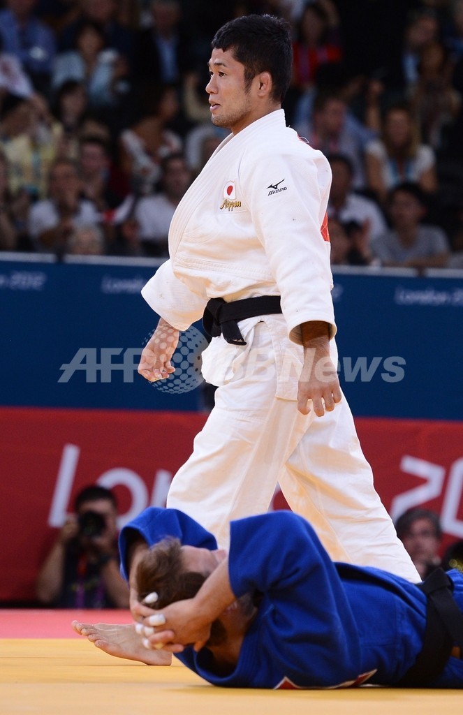 エーリオ・ベルデ(下)から一本勝ちを収めた平岡拓晃(2012年7月28日撮影)。(c)AFP/FRANCK FIFE