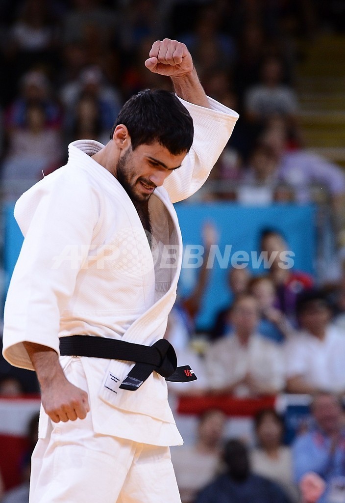 一本勝ちを収め歓喜するアルセン・ガルスチャン(2012年7月28日撮影)。(c)AFP/NCK FIFE