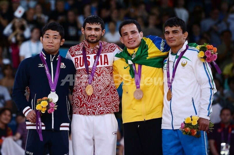 表彰式に臨む(左から)銀メダルを獲得した平岡拓晃、金メダルを獲得したアルセン・ガルスチャン、銅メダルを獲得したブラジルのフェリペ・キタダイ(Felipe Kitadai)とウズベキスタンのリショド・ソビロフ(Rishod Sobirov、2012年7月28日撮影)。(c)AFP/FRANCK FIFE