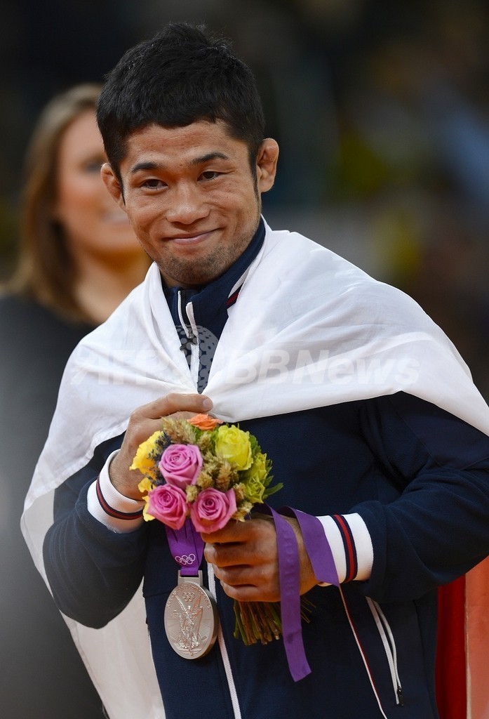 表彰式で銀メダルを手にする日本の平岡拓晃(2012年7月28日撮影)。(c)AFP/ADRIAN DENNIS