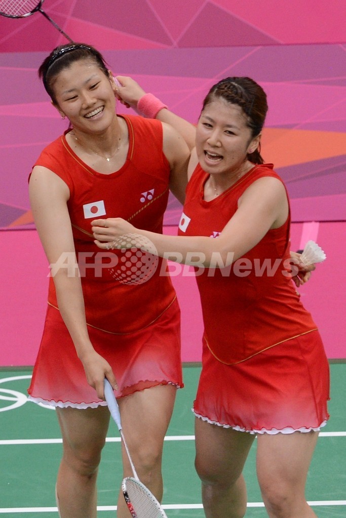 勝利を喜ぶ垣岩令佳と藤井瑞希(2012年7月28日撮影)。(c)AFP/ADEK BERRY