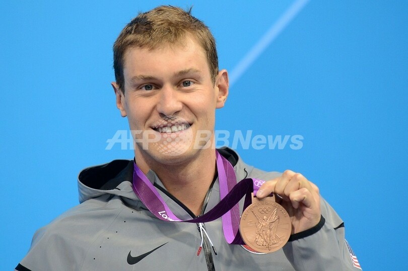 表彰式で銅メダルを手に笑顔を見せるピーター・バンデルカーイ(Peter Vanderkaay、2012年7月28日撮影)。(c)AFP/MARTIN BUREAU