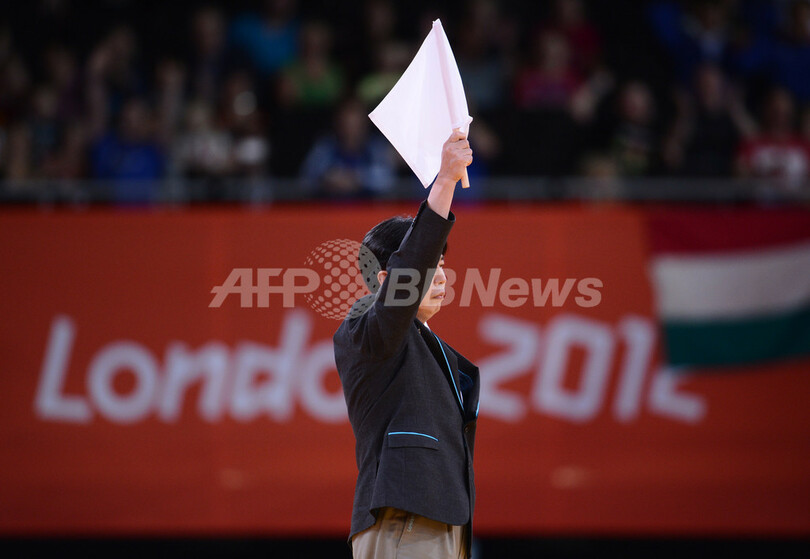 海老沼の勝利を示す白旗を揚げる主審(2012年7月29日撮影)。(c)AFP/FRANCK FIFE