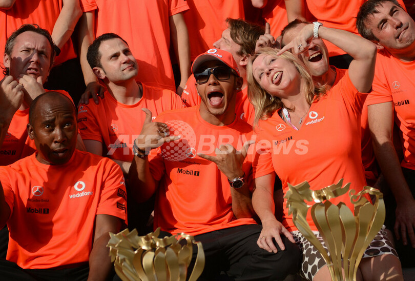 レース終了後にチームスタッフと記念撮影を行うマクラーレン・メルセデスのルイス・ハミルトン(2012年7月29日撮影)。(c)AFP/DIMITAR DILKOFF