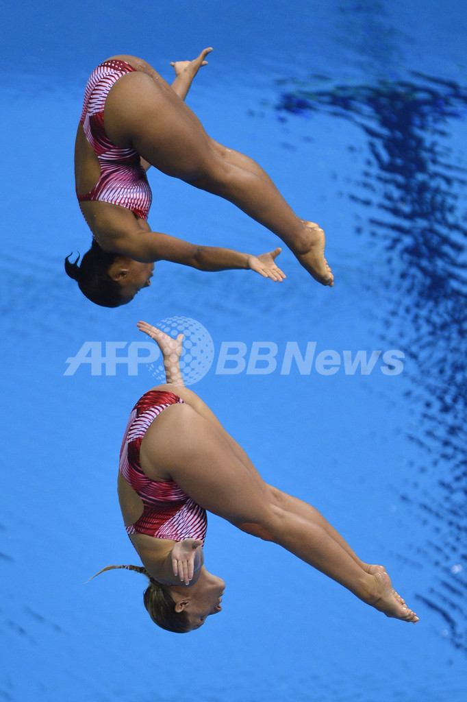 米国のケルシ・ブライアント(Kelci Bryant)/アビゲイル・ジョンストン(Abigail Johnston)組が321.90点で銀メダル、カナダのジェニファー・アベル(Jennifer Abel)/エミリー・ハイマンズ(Emilie Heymans)組が316.80点で銅メダルを獲得した。(c)AFP