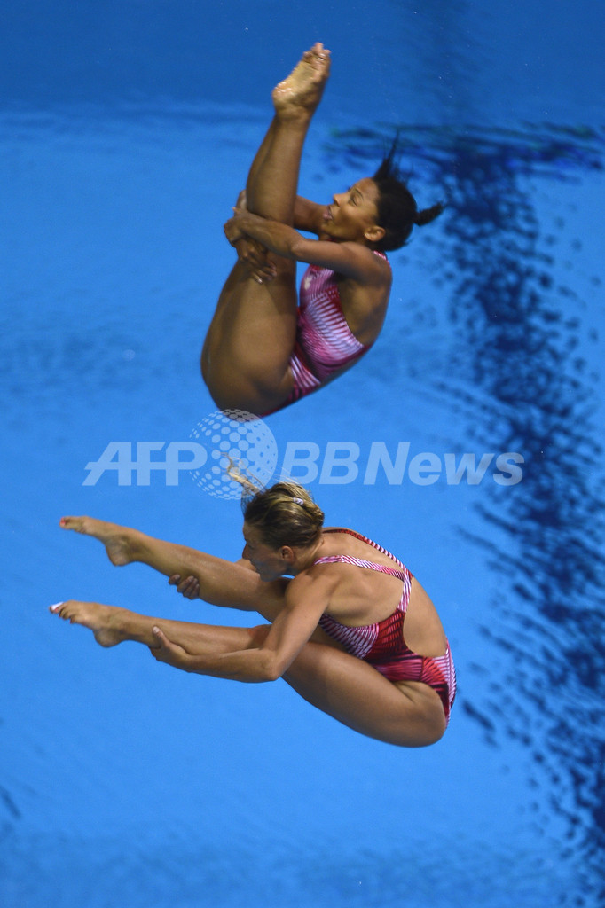 試技に臨むカナダのジェニファー・アベル(Jennifer Abel)とエミリー・ハイマンズ(Emilie Heymans、2012年7月29日撮影)。(c)AFP/FABRICE COFFRINI