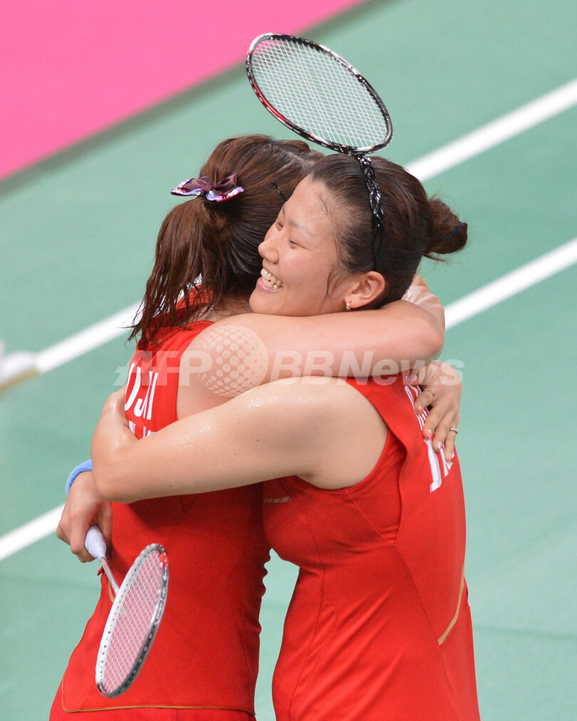 勝利を喜ぶ藤井瑞希(左)と垣岩令佳(2012年7月29日撮影)。(c)AFP/ADEK BERRY