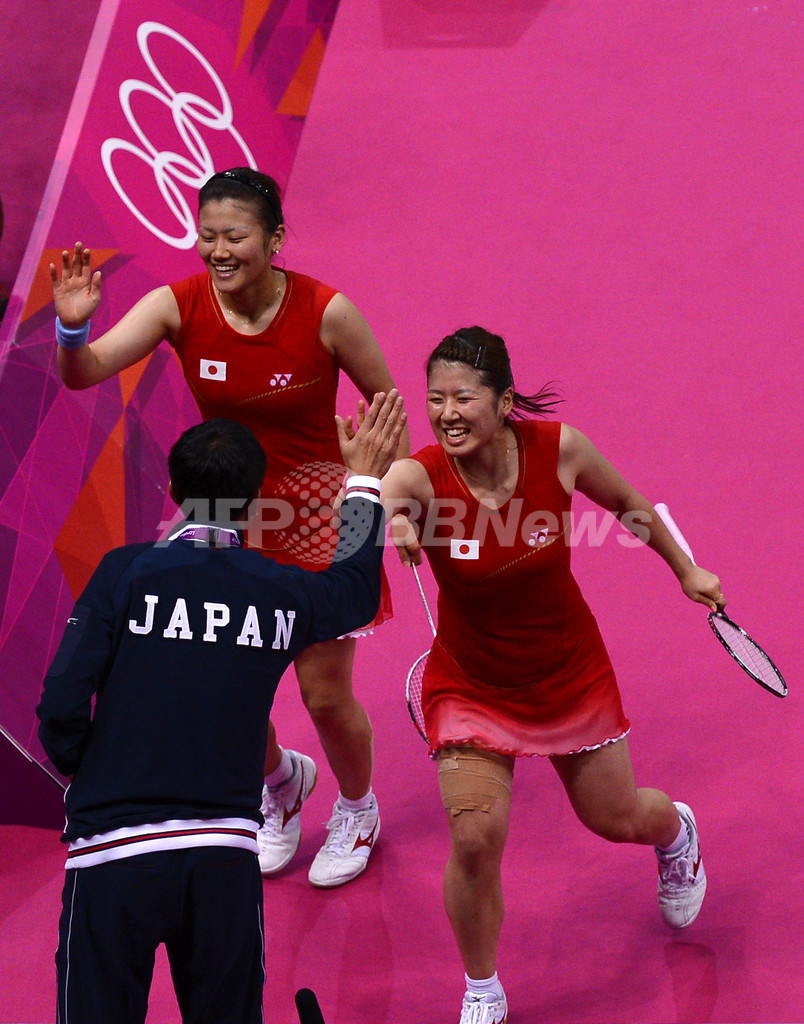 勝利を喜ぶ藤井瑞希(右)と垣岩令佳(2012年7月29日撮影)。(c)AFP/ADRIAN DENNIS