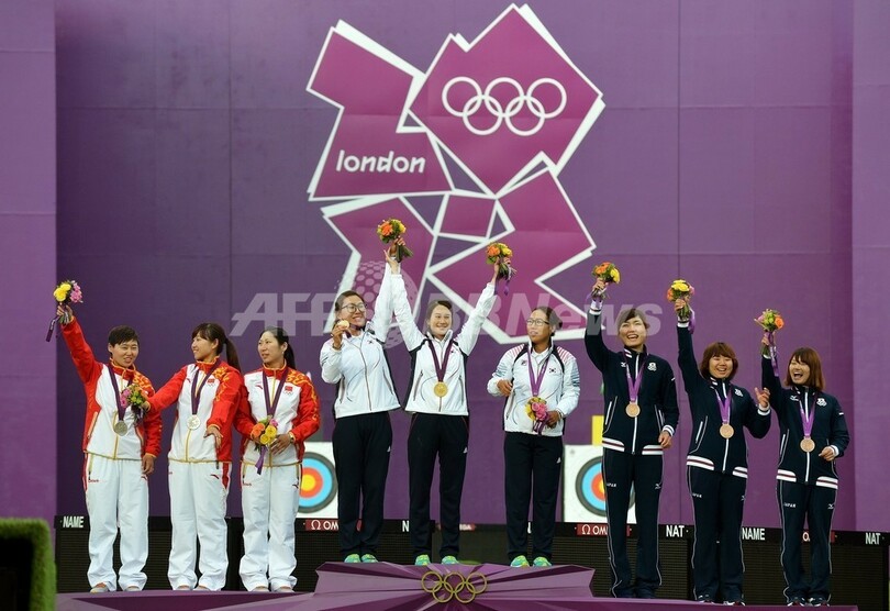 表彰式に臨む(左から)銀メダルの中国チーム、金メダルの韓国チーム、銅メダルの日本チーム(2012年7月29日撮影)。(c)AFP/JEWEL SAMAD