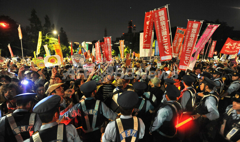 【7月30日 AFP】都内で29日、東京電力(TEPCO)福島第1原発事故後の原発稼働に反対する抗議行動「7.29脱原発国会大包囲」が行われ、火を灯したろうそくやプラカードを手にした参加者らが国会議事堂を取り囲んだ。