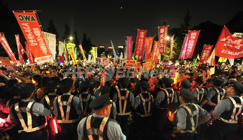 【7月30日 AFP】都内で29日、東京電力(TEPCO)福島第1原発事故後の原発稼働に反対する抗議行動「7.29脱原発国会大包囲」が行われ、火を灯したろうそくやプラカードを手にした参加者らが国会議事堂を取り囲んだ。