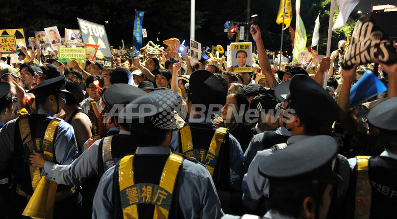 【7月30日 AFP】都内で29日、東京電力(TEPCO)福島第1原発事故後の原発稼働に反対する抗議行動「7.29脱原発国会大包囲」が行われ、火を灯したろうそくやプラカードを手にした参加者らが国会議事堂を取り囲んだ。