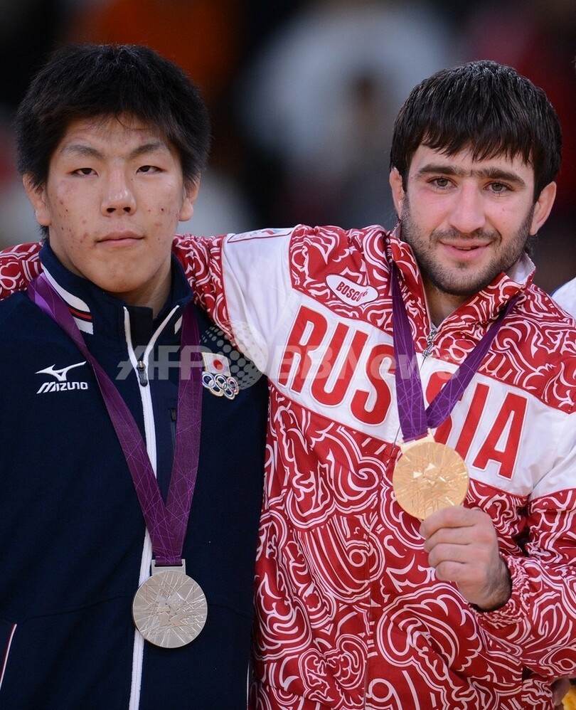 表彰式に臨むマンスール・イサエフと中矢力(左、2012年7月30日撮影)。(c)AFP/FRANCK FIFE