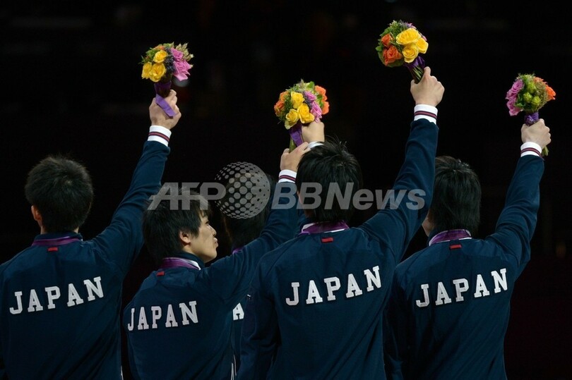 表彰式で歓喜する日本の選手(2012年7月30日撮影)。(c)AFP/EMMANUEL DUNAND