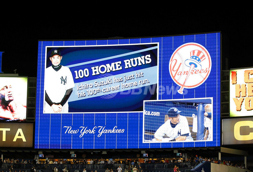 7回に本塁打を放ったニューヨーク・ヤンキースのイチローの大リーグ通算100本本塁打を祝福するスタジアムの電光掲示(2012年7月31日撮影)。(c)AFP/Getty Images/Jim McIsaac