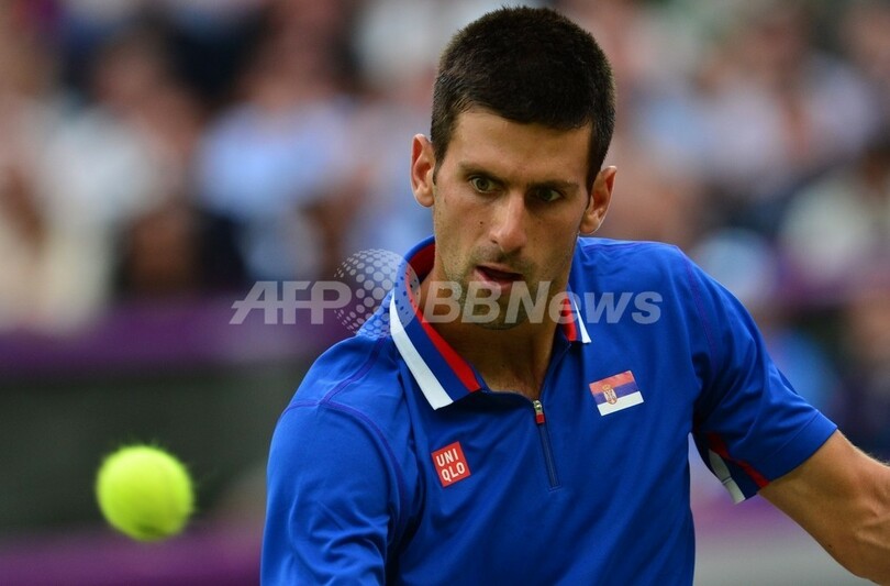 リターンを打つノバク・ジョコビッチ(2012年7月31日撮影)。(c)AFP/Martin BERNETTI