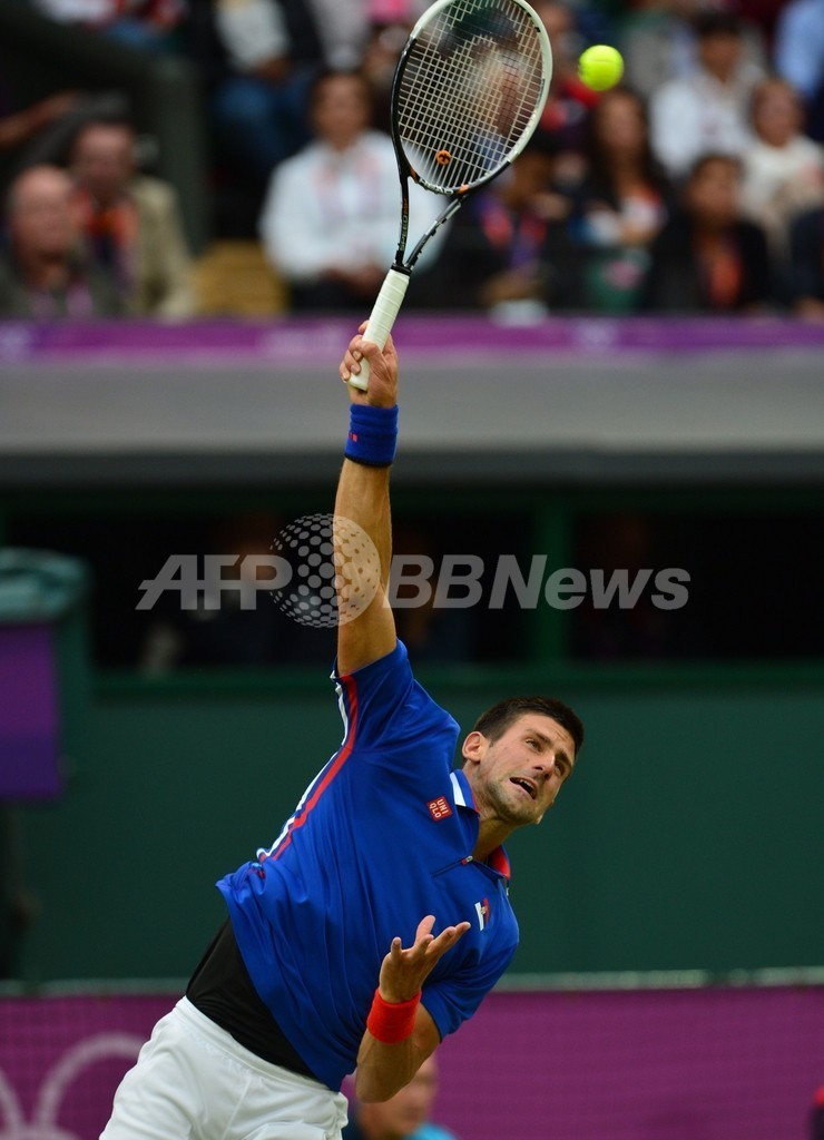 サーブを放つノバク・ジョコビッチ(2012年7月31日撮影)。(c)AFP/Martin BERNETTI