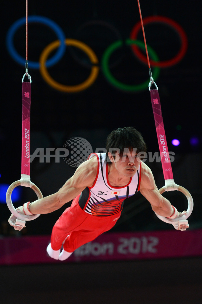 つり輪の演技に臨む内村航平(2012年8月1日撮影)。(c)AFP/EMMANUEL DUNAND