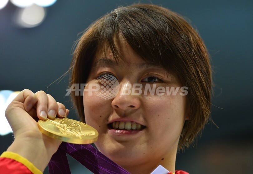表彰式で金メダルを掲げる中国の焦劉洋(Jiao Liuyang、2012年8月1日撮影)。(c)AFP/GABRIEL BOUYS