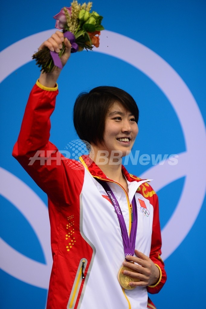 表彰式で歓声に応える中国の焦劉洋(Jiao Liuyang、2012年8月1日撮影)。(c)AFP/MARTIN BUREAU