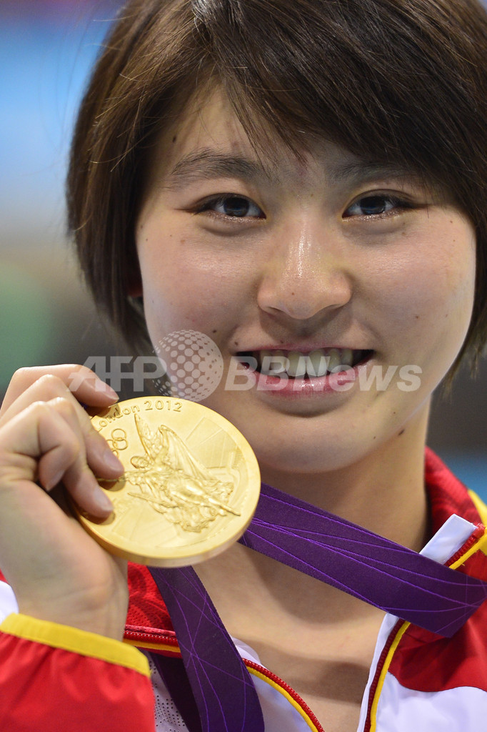 表彰式で金メダルを掲げる中国の焦劉洋(Jiao Liuyang、2012年8月1日撮影)。(c)AFP/FABRICE COFFRINI