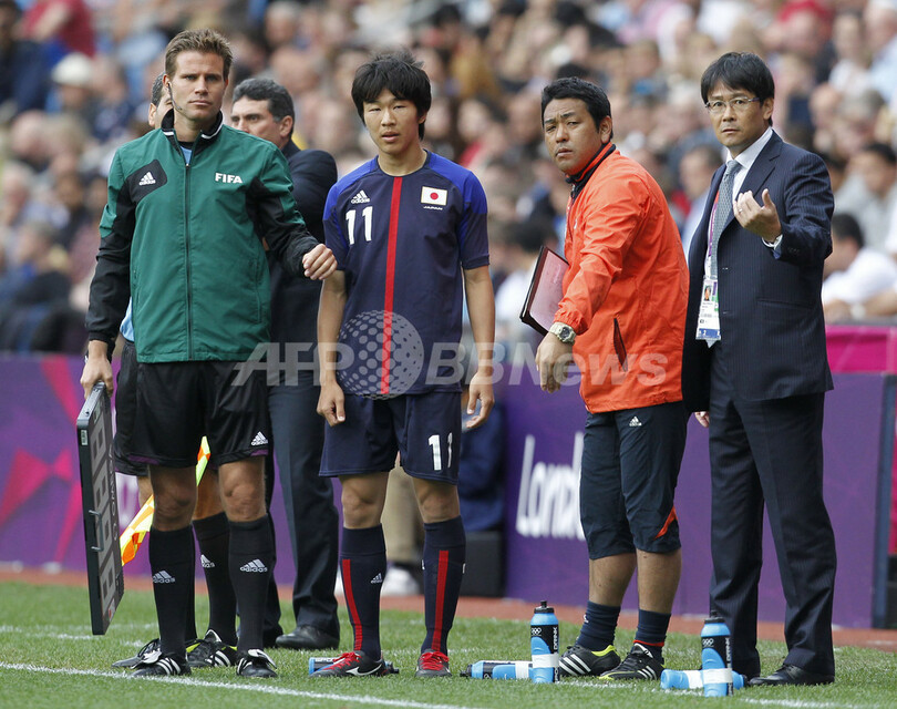 交代を待つ日本の永井謙佑(Kensuke Nagai、中央、2012年8月1日撮影)。(c)AFP/IAN KINGTON