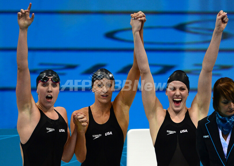 【8月2日 AFP】ロンドン五輪は1日、アクアティクス・センター(Aquatics Centre)で競泳女子4×200メートルリレー決勝が行われ、米国が7分42秒92の五輪新記録で金メダルを獲得した。