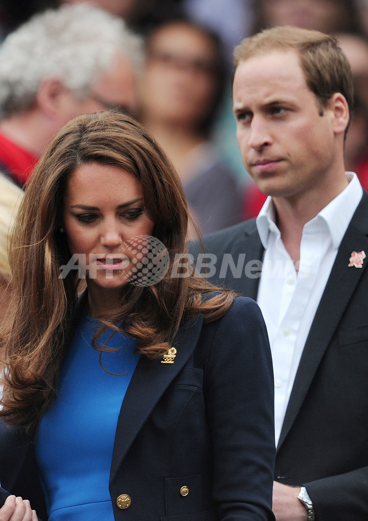 試合観戦に訪れたウィリアム王子(Prince William、右)とキャサリン妃(Catherine, Duchess of Cambridge、2012年8月2日撮影)。(c)AFP/CARL COURT