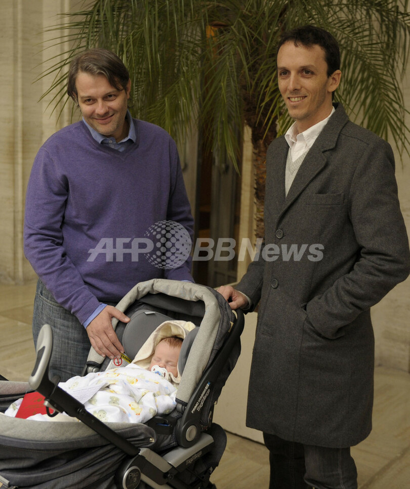 写真は、トビアスちゃんと一緒に登記所を訪れたアレハンドロさん(左)とグスタボさん(右、2012年7月31日撮影)。(c)AFP/JUAN MABROMATA