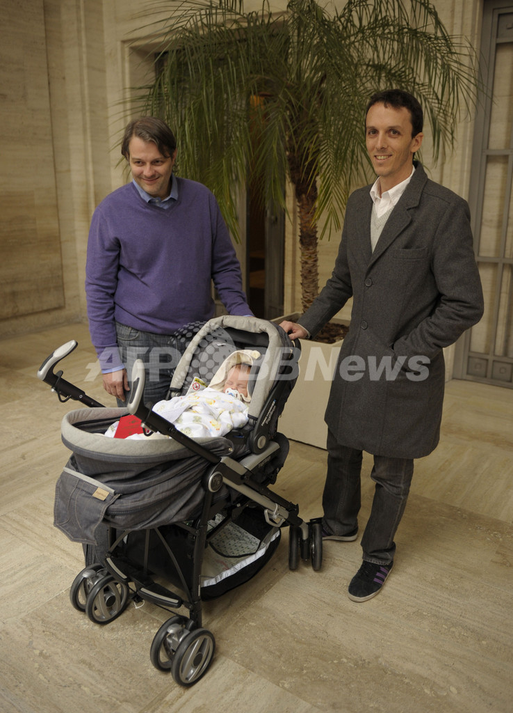 写真は、トビアスちゃんと一緒に登記所を訪れたアレハンドロさん(左)とグスタボさん(右、2012年7月31日撮影)。(c)AFP/JUAN MABROMATA