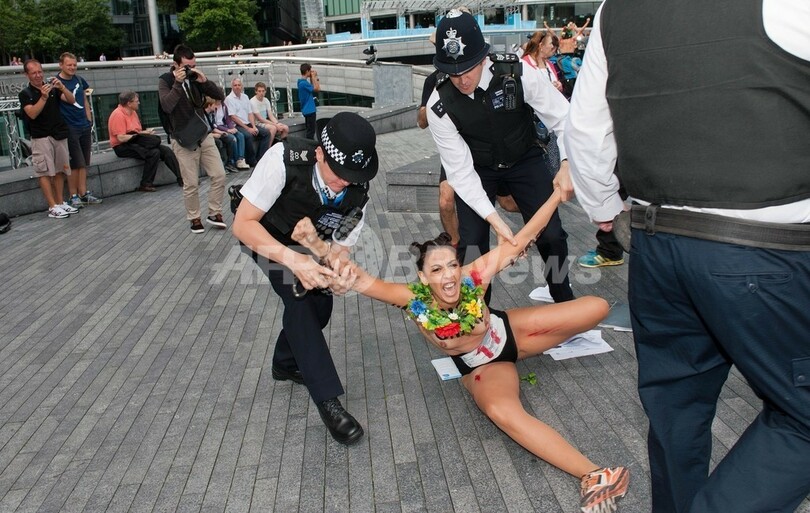 【8月3日 AFP】五輪開催中のロンドン(London)のタワーブリッジ(Tower Bridge)近くで2日、ウクライナの女性権利団体「FEMEN」のメンバーがトップレスで国際五輪委員会(International Olympic Committee、ICC)に抗議した。FEMENは、IOCが「イスラム体制を支援している」と批判している。(c)AFP