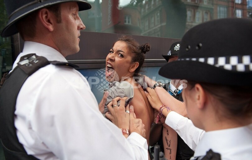 【8月3日 AFP】五輪開催中のロンドン(London)のタワーブリッジ(Tower Bridge)近くで2日、ウクライナの女性権利団体「FEMEN」のメンバーがトップレスで国際五輪委員会(International Olympic Committee、ICC)に抗議した。FEMENは、IOCが「イスラム体制を支援している」と批判している。(c)AFP