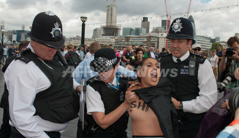 【8月3日 AFP】五輪開催中のロンドン(London)のタワーブリッジ(Tower Bridge)近くで2日、ウクライナの女性権利団体「FEMEN」のメンバーがトップレスで国際五輪委員会(International Olympic Committee、ICC)に抗議した。FEMENは、IOCが「イスラム体制を支援している」と批判している。(c)AFP