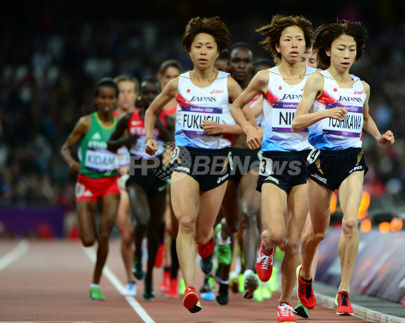レースに臨む日本の(右から)吉川美香(Mika Yoshikawa)、新谷仁美(Hitomi Niiya)、福士加代子(Kayoko Fukushi、2012年8月3日撮影)。(c)AFP/OLIVIER MORIN