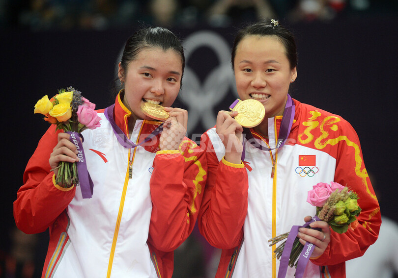 表彰式に臨む中国の田卿(左)と趙ウン蕾(2012年8月4日撮影)。(c)AFP/ADEK BERRY