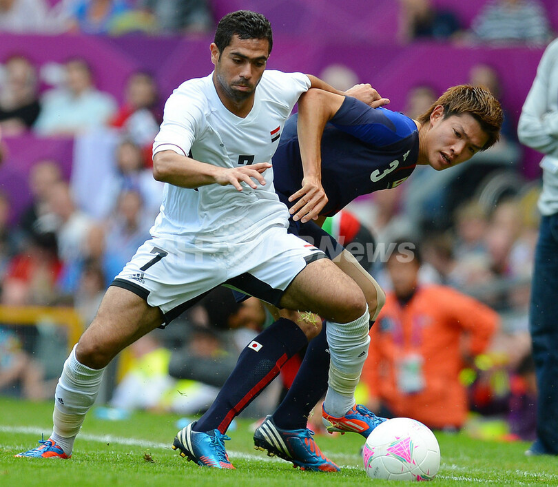 エジプトのアーメド・ファティ(Ahmed Fathi、左)とボールを競る扇原貴宏(Takahiro Ohgihara、2012年8月4日撮影)。(c)AFP/ANDREW YATES