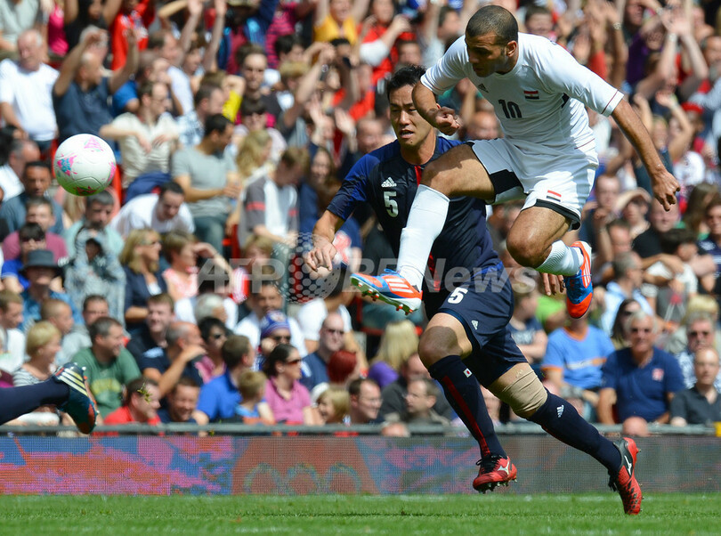 吉田麻也(Maya Yoshida)とボールを競るエジプトのエマド・メタブ(Imad Meteab、2012年8月4日撮影)。(c)AFP/ANDREW YATES