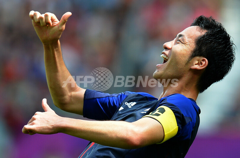 後半33分にチーム2得点目を挙げて歓喜する吉田麻也(Maya Yoshida、2012年8月4日撮影)。(c)AFP/ANDREW YATES