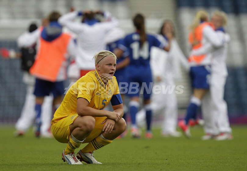 試合に敗れ落胆するスウェーデンのニラ・フィッシャー(Nilla Fischer、2012年8月3日撮影)。(c)AFP/GRAHAM STUART