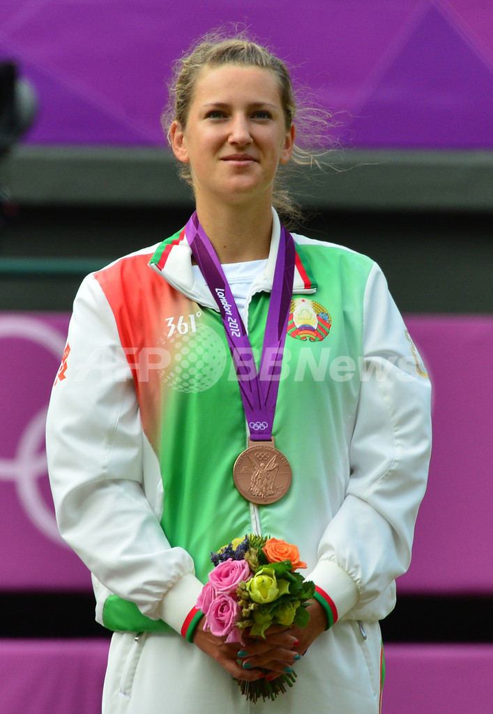 五輪で初めてメダルを獲得した世界ランク1位のアザレンカは試合後、母国ベラルーシの国旗をまとって喜びに浸っていた。
