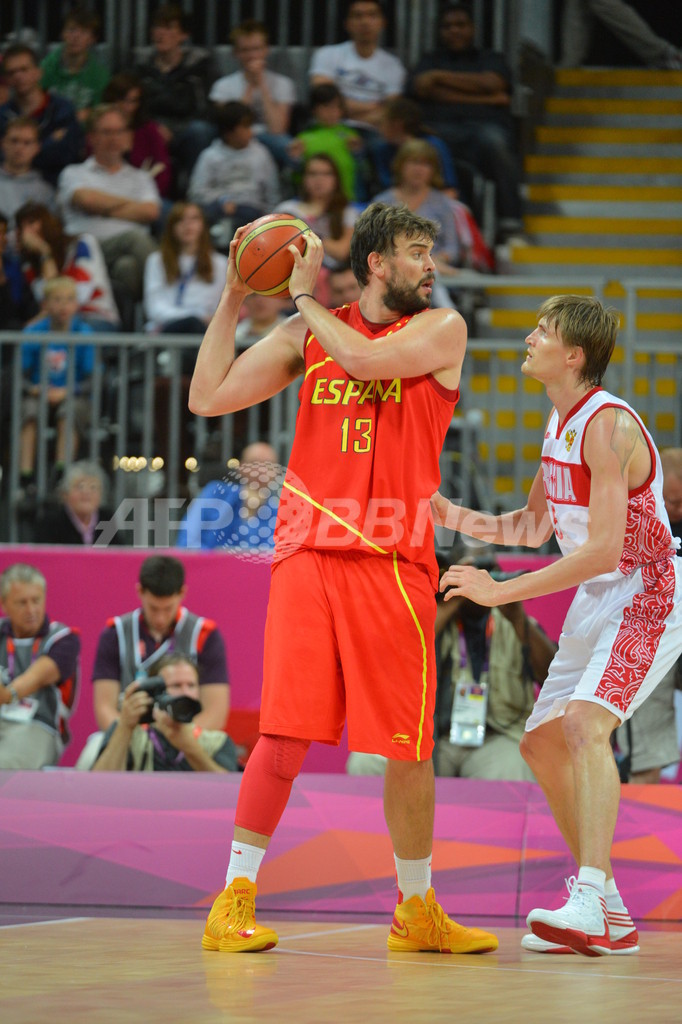 ロシアのアンドレイ・キリレンコ(Andrei Kirilenko)にマークされるスペインのマルク・ガソル(Marc Gasol、2012年8月4日撮影)。(c)AFP/Getty Images/Jesse D. Garrabrant
