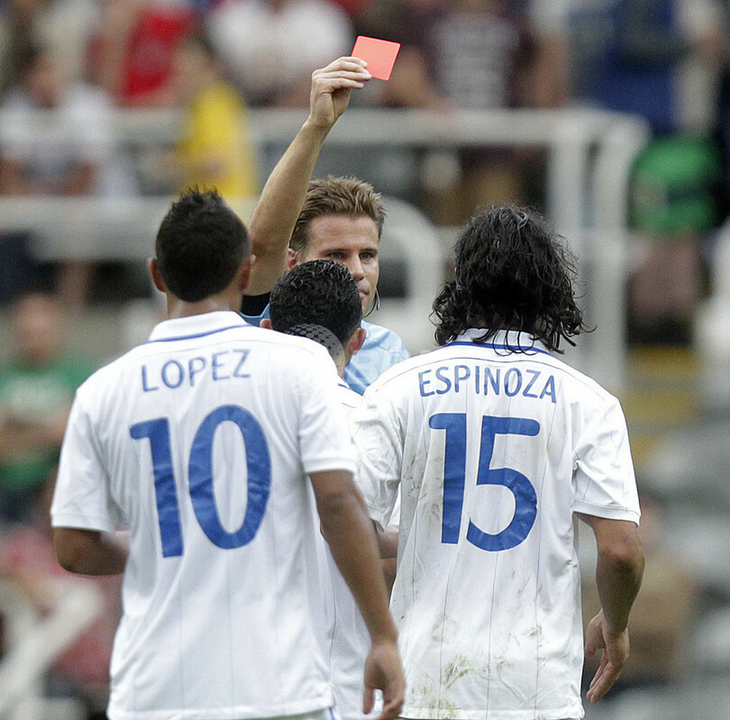 試合終了間際に主審からレッドカードの提示を受けるホンジュラスのロヘル・エスピノサ(Roger Espinoza、右、2012年8月4日撮影)。(c)AFP/GRAHAM STUART