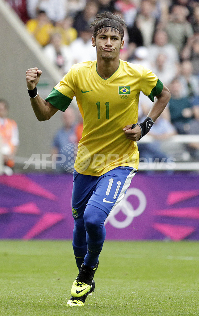 後半3分にペナルティーキック(PK)を決め歓喜するブラジルのネイマール(Neymar da Silva Santos Junior、2012年8月4日撮影)。(c)AFP/GRAHAM STUART