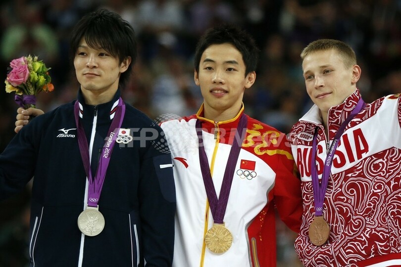 表彰式に臨む(左から)内村航平、中国の鄒凱(Zou Kai、ツォウ・カイ)、ロシアのデニス・アブリャジン(Denis Ablyazin、2012年8月5日撮影)。(c)AFP/THOMAS COEX