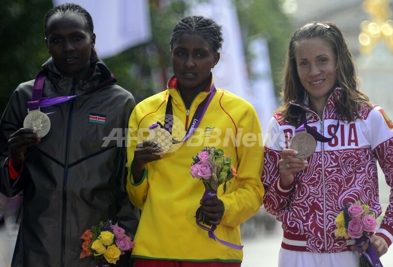 表彰式に臨む(左から)銀メダルのプリスカ・ジェプトゥー(Priscah Jeptoo)、金メダルのティキ・ゲラナ、銅メダルのタチアナ・ペトロワ(Tatyana Petrova、2012年8月5日撮影)。(c)AFP/DANIEL GARCIA