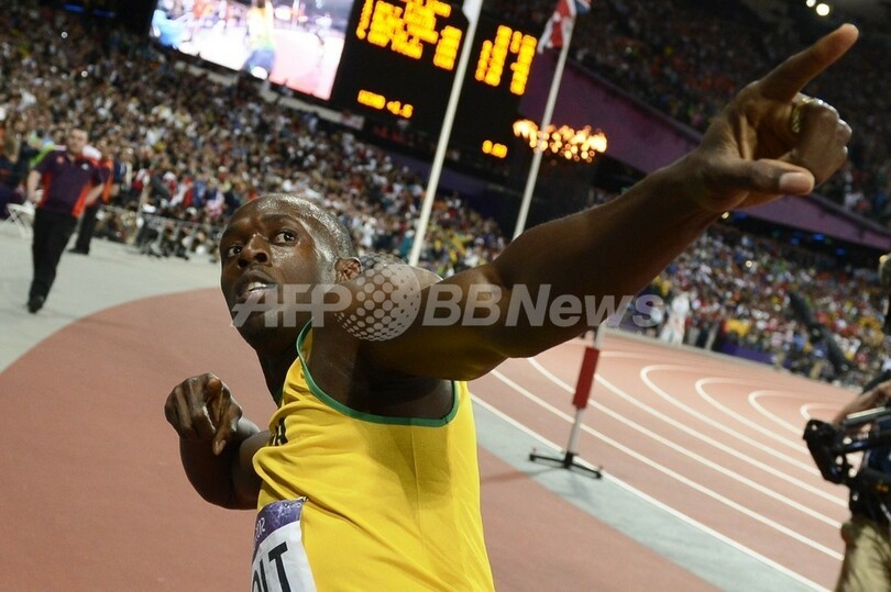金メダル獲得を喜ぶジャマイカのウサイン・ボルト(2012年8月5日撮影)。(c)AFP/ADRIAN DENNIS