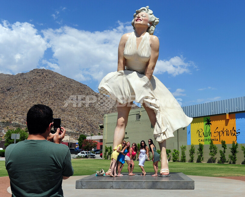 【8月5日 AFP】米女優マリリン・モンロー(Marilyn Monroe)の死から50年を翌日に控えた4日、米カリフォルニア州のパームスプリングズ(Palm Springs)では、出演作の名場面を再現した巨大な像「フォーエバー・マリリン(Forever Marilyn)」が注目スポットとなり、訪れた人々が写真撮影に興じていた。